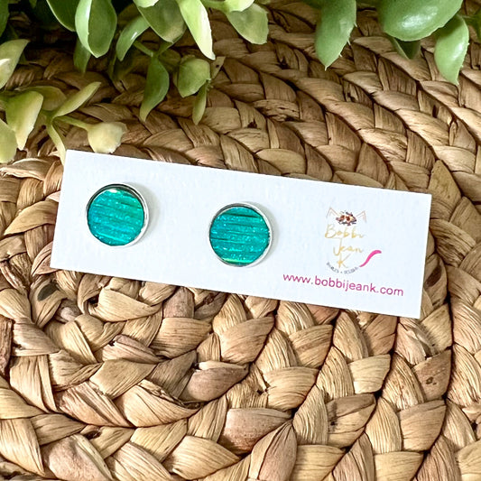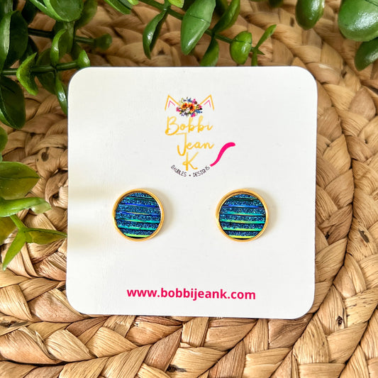 SALE: Iridescent Blue/Green "Striped" Faux Druzy Studs 12mm: Choose Silver or Gold Settings