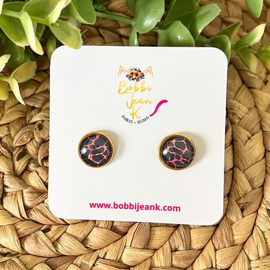 SALE: Pink & Black Leopard Animal Print Glass Studs 12mm: Choose Silver or Gold Settings - LAST CHANCE