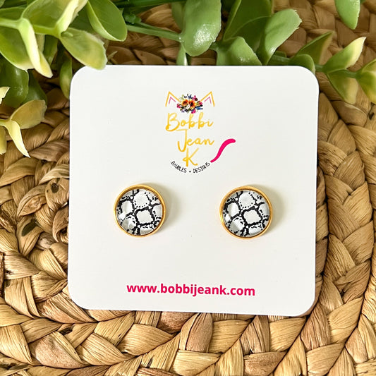 SALE: Black & White Snakeskin Animal Print Glass Studs 12mm: Choose Silver or Gold Settings - LAST CHANCE