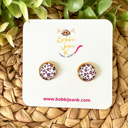 SALE: Pink Leopard Animal Print Glass Studs 12mm: Choose Silver or Gold Settings - ONLY 2 LEFT