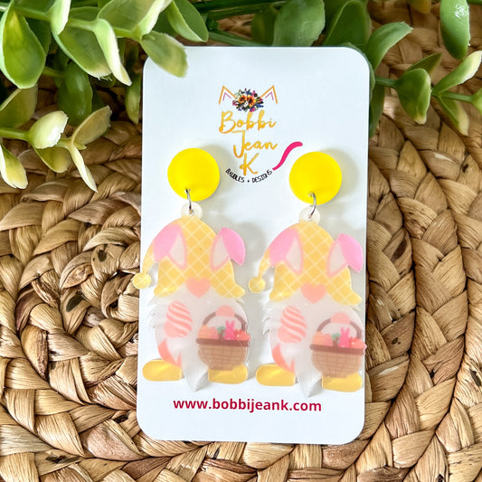 SALE: Yellow Gnome with Basket Acrylic Dangle Earrings: Choose Stud or Ear Wire - ONLY ONE LEFT