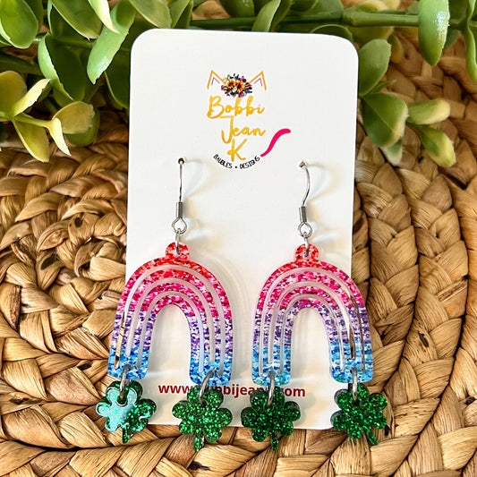 Colorful Rainbow with Glittered Clovers Acrylic Earrings: Choose From 2 Color Ways