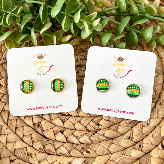 SALE: Green Patchwork Glass Studs 12mm: Choose Silver or Gold Settings - LAST CHANCE