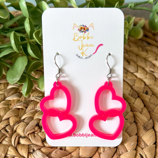 Hot Pink Acrylic Connected Double Heart Earrings: Choose From 2 Sizes