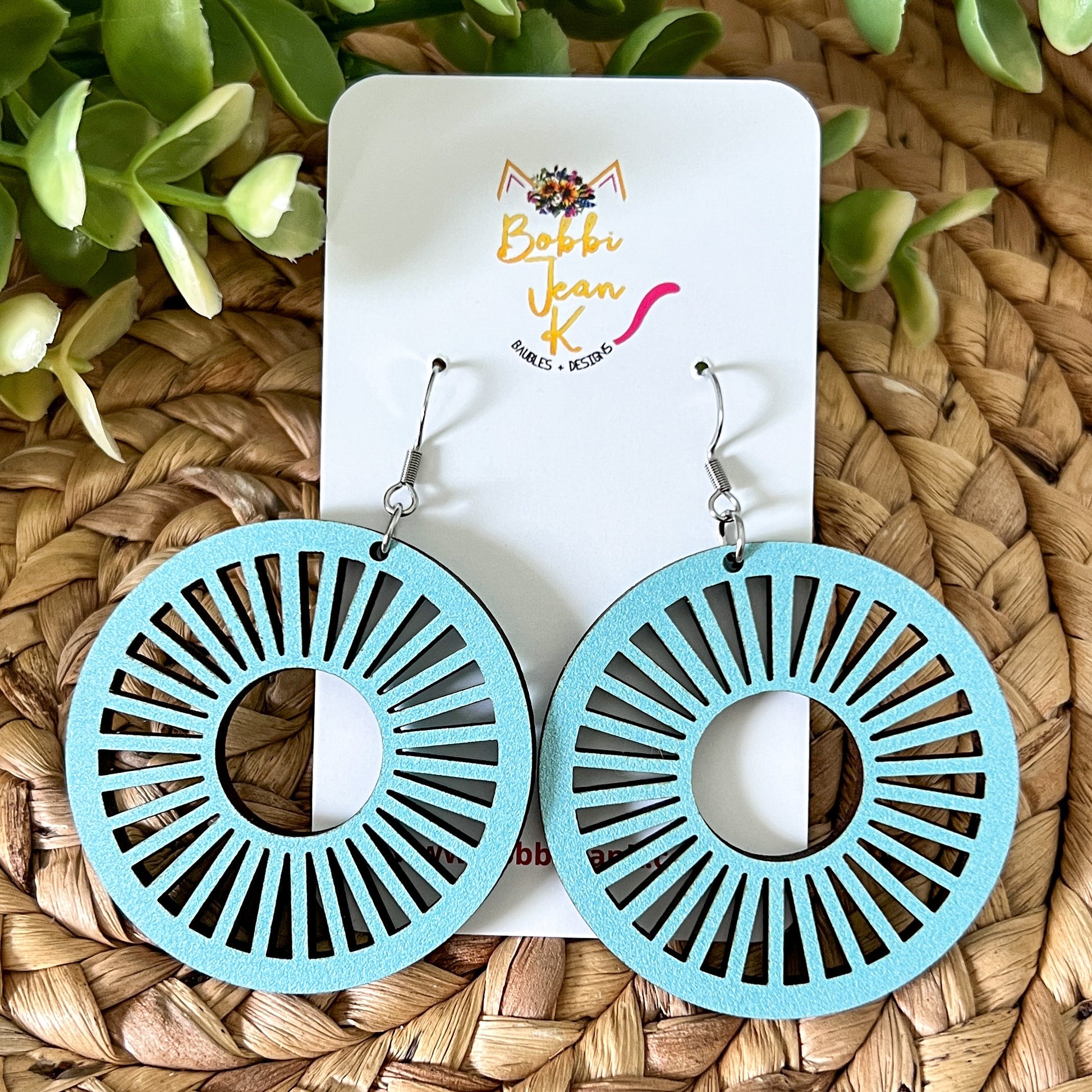 Baby Blue Wood Circle Cutout Earrings: Choose From 2 Sizes