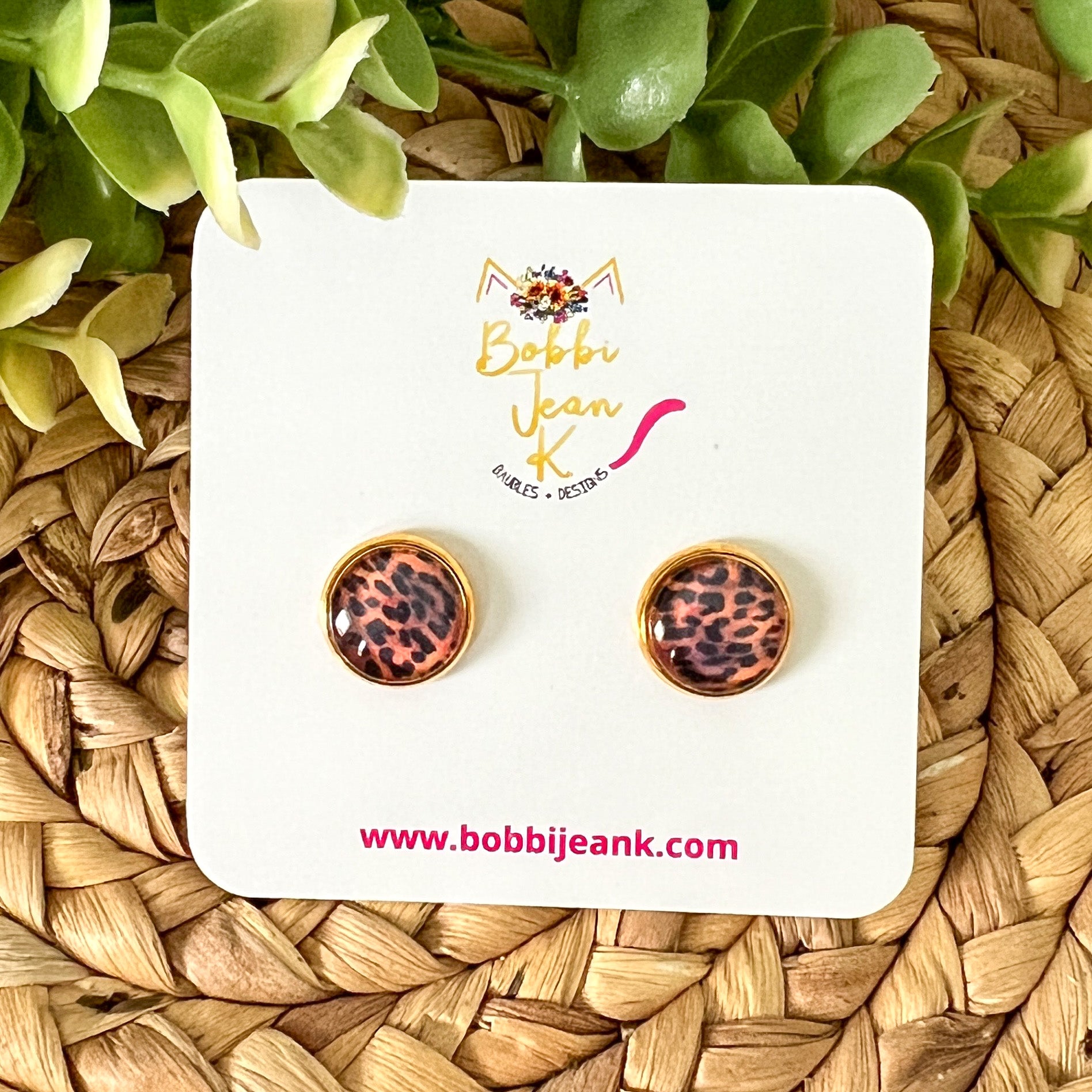 SALE: Black & Amber Leopard Animal Print Glass Studs 12mm: Choose Silver or Gold Settings - ONLY 2 LEFT