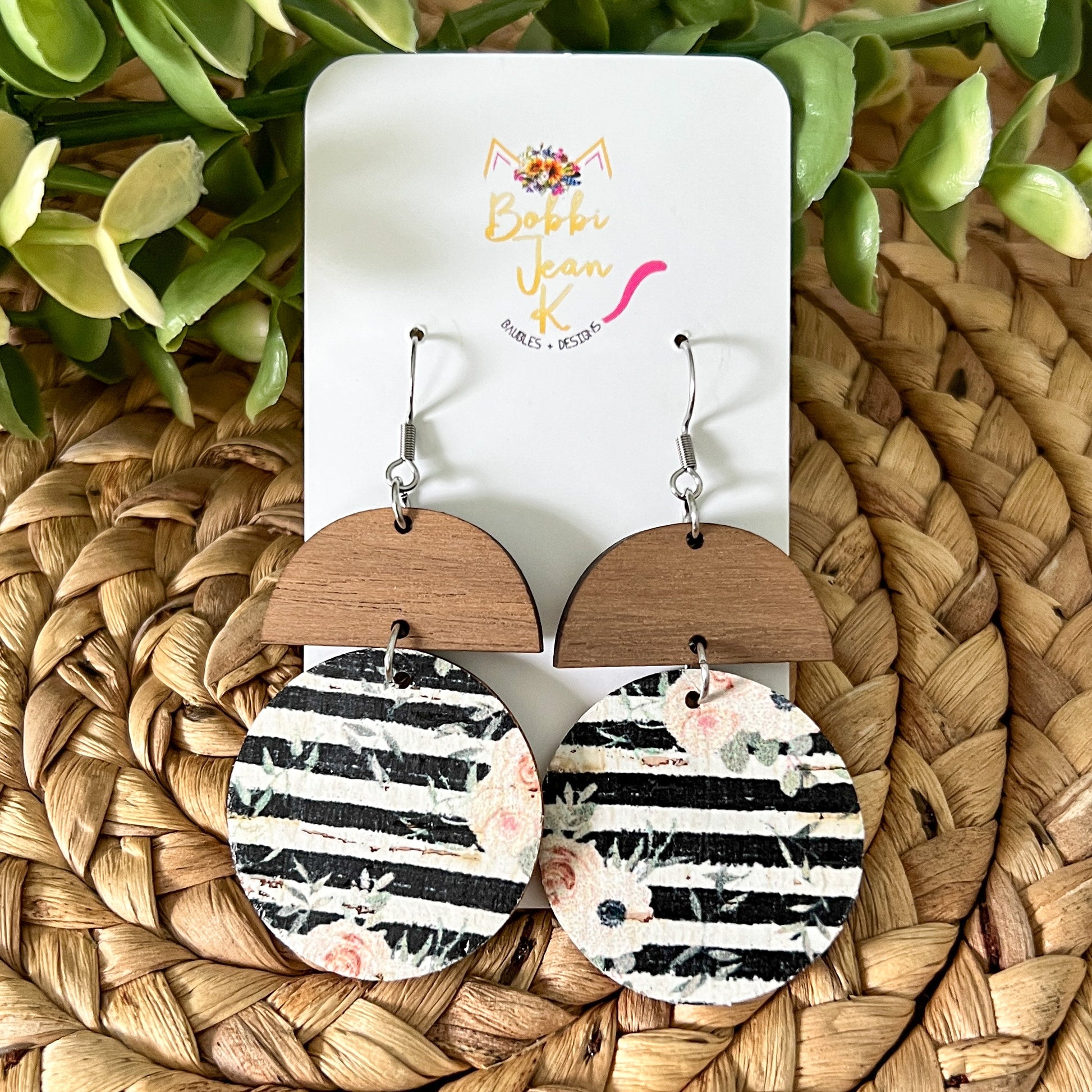 SALE: Black & White Striped Floral Cork on Leather Earrings: Choose From 2 Styles - LAST CHANCE