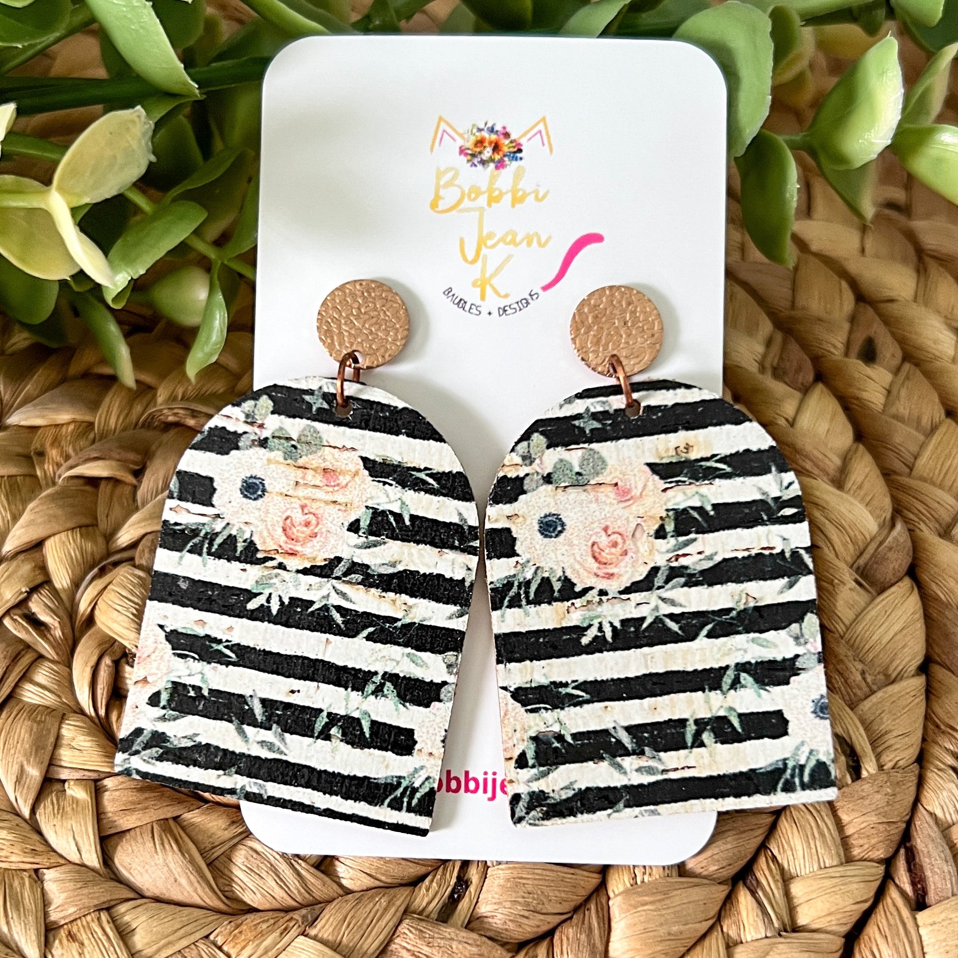 - Style: Black & White Striped Floral Cork on Leather Earrings