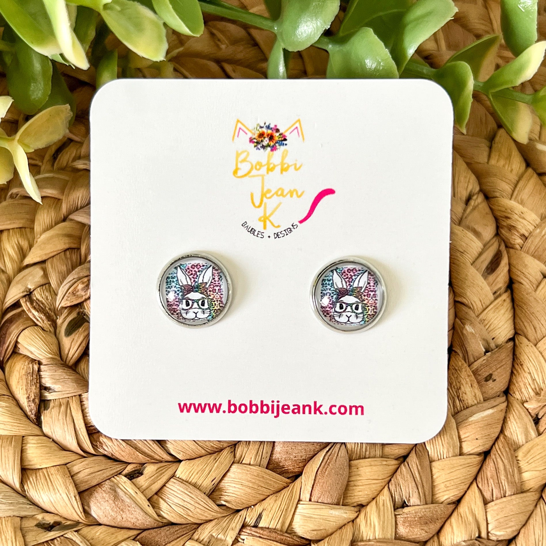 SALE: Bunny with Glasses Glass Studs 12mm: Choose Silver or Gold Settings - ONLY ONE LEFT