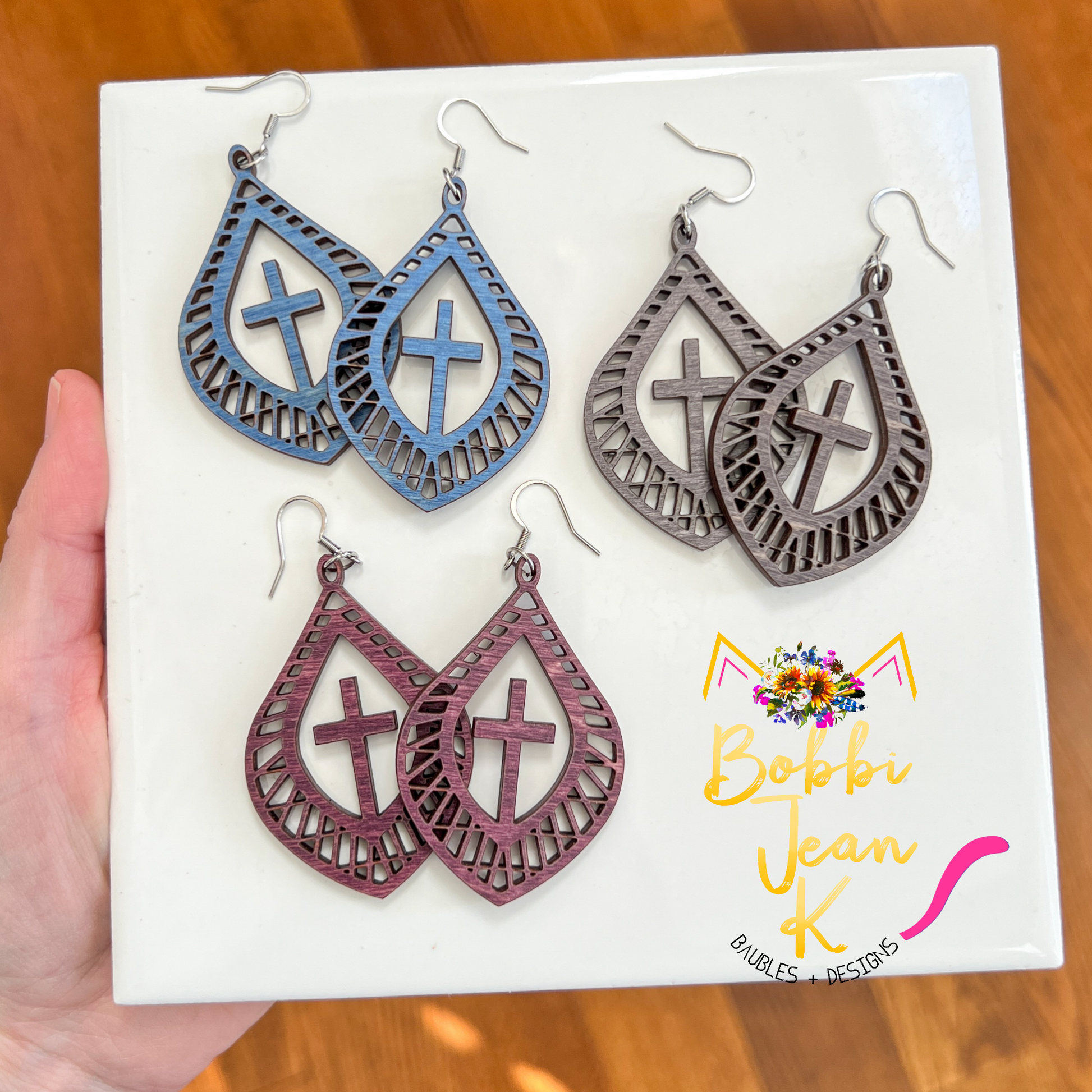 Flourished Teardrop Cross Dyed Wood Earrings: Choose From 3 Colors - LAST CHANCE - DESIGN BEING DISCONTINUED (Was $14)