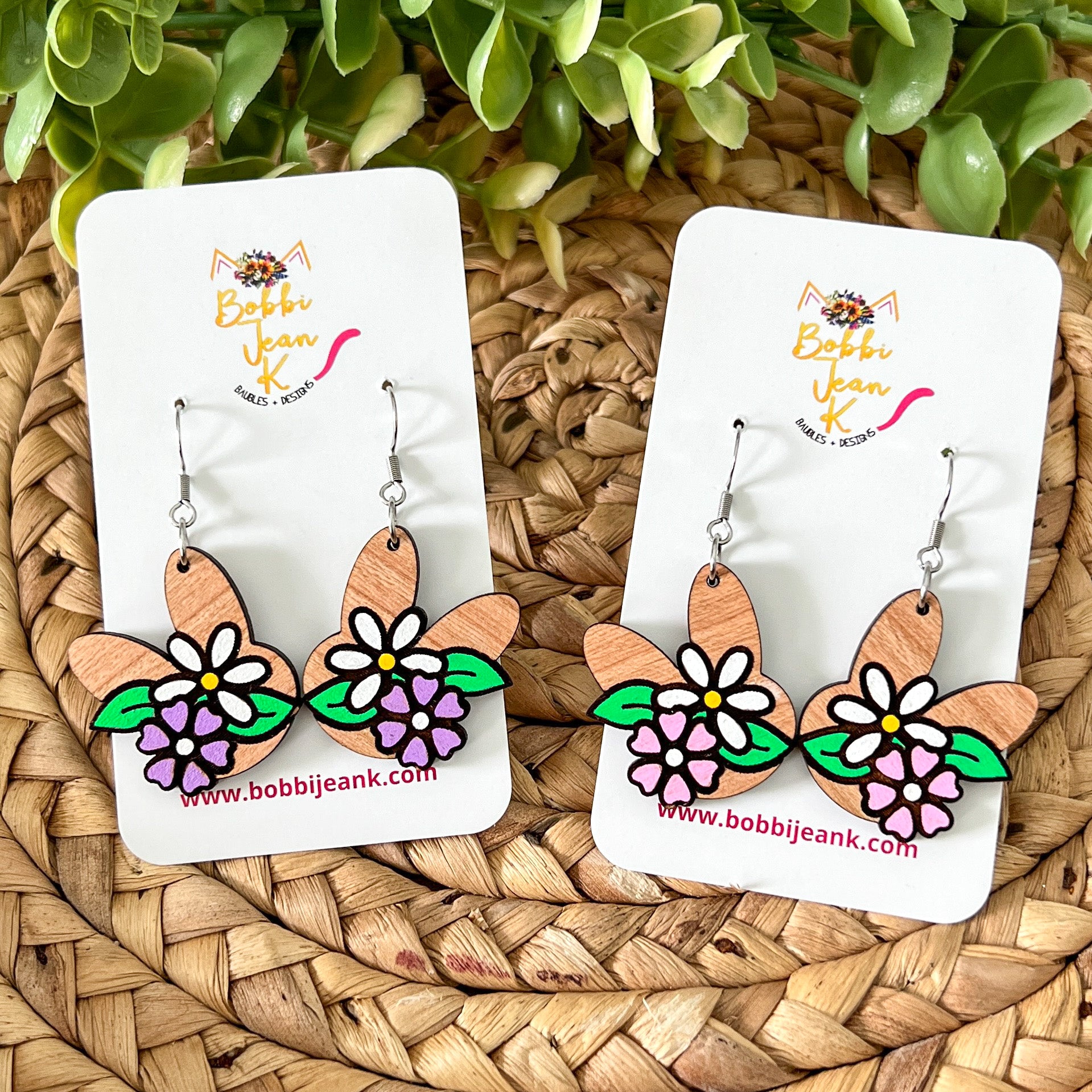 Hand Painted Floral Bunny Wood Earrings: Choose From 2 Color Options
