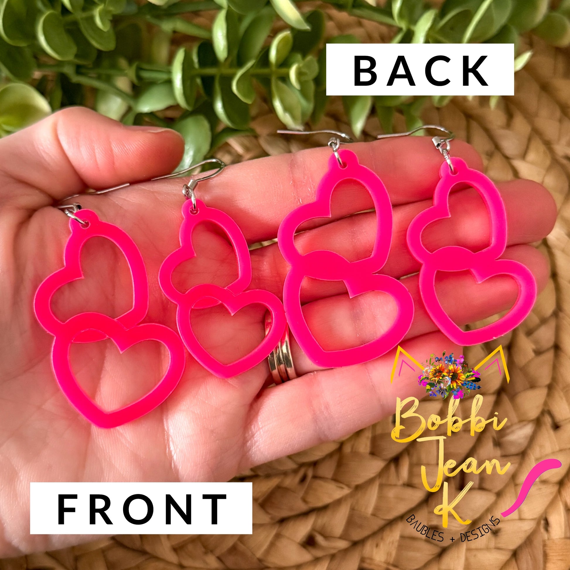 Hot Pink Acrylic Connected Double Heart Earrings: Choose From 2 Sizes