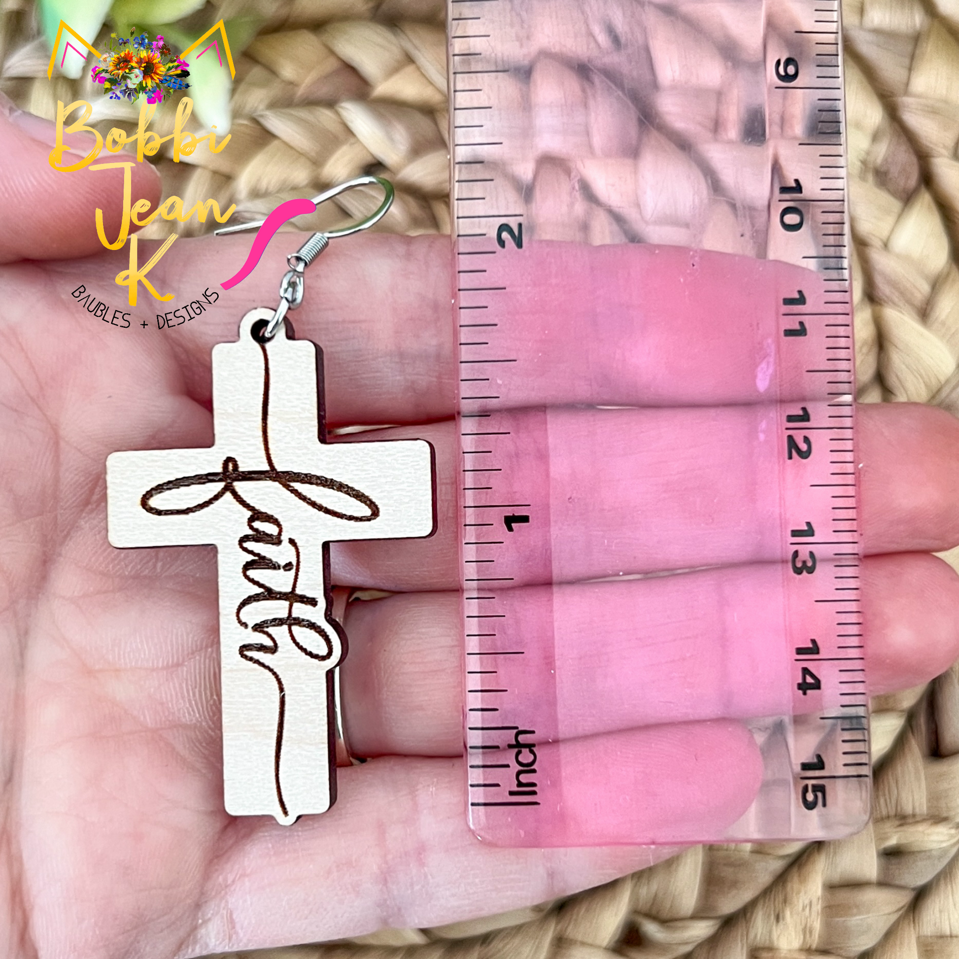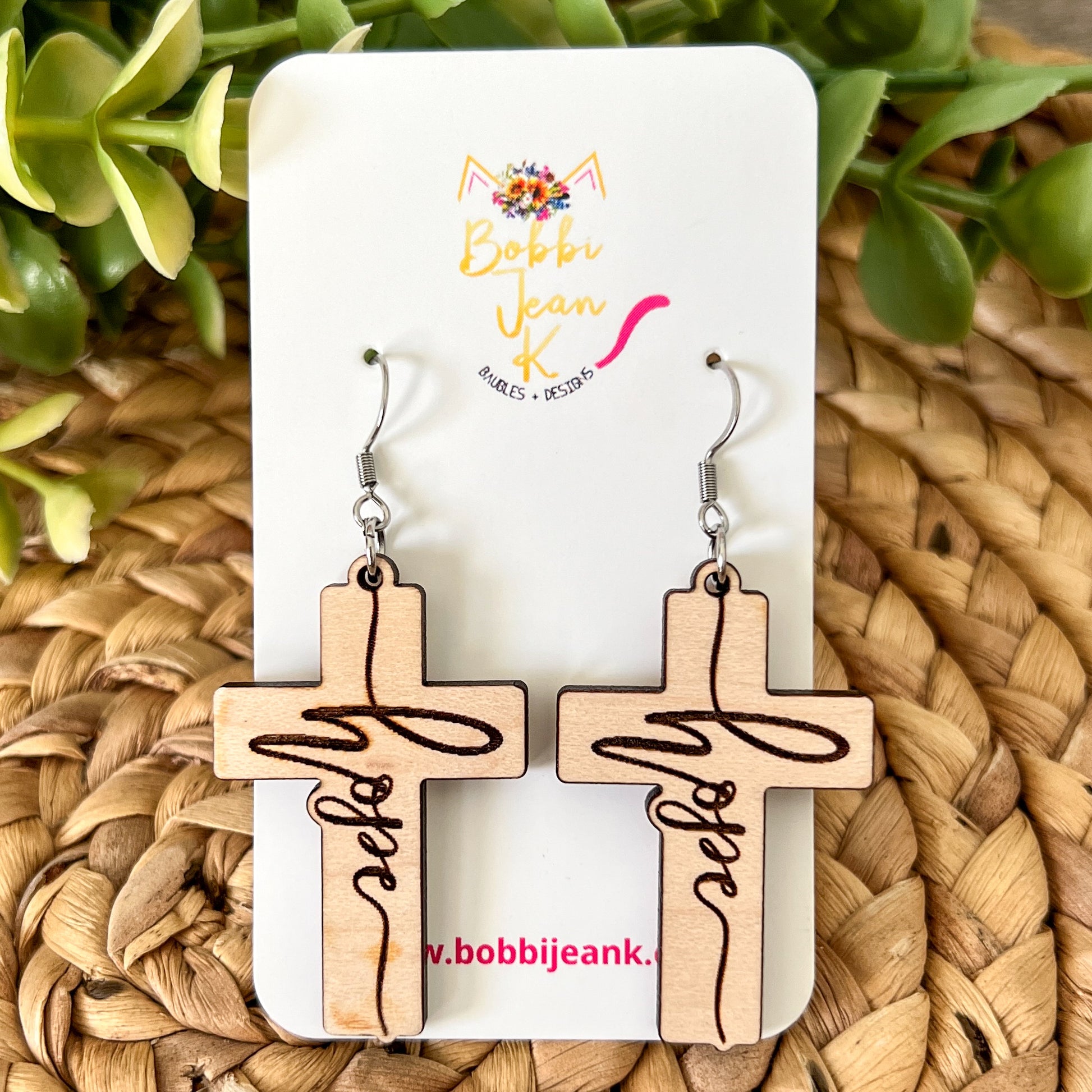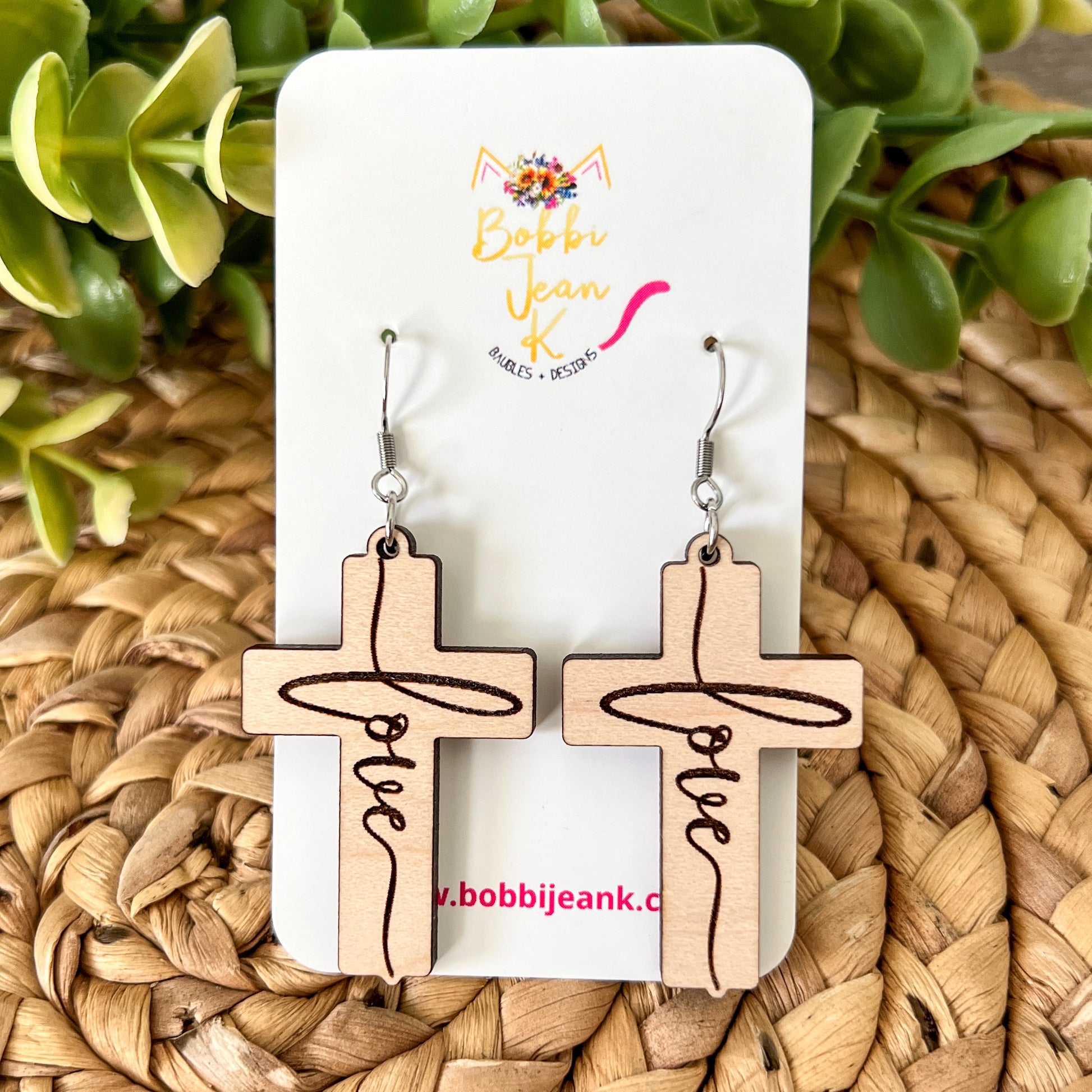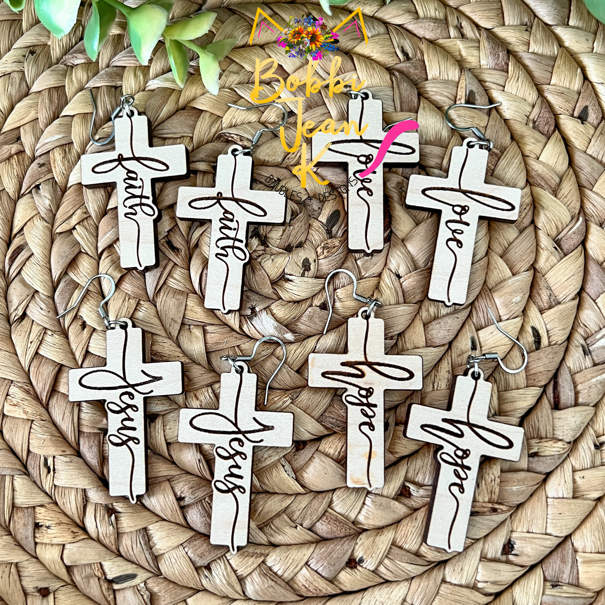 Maple Wood Cross Earrings: Choose From Jesus, Faith, Hope, or Love