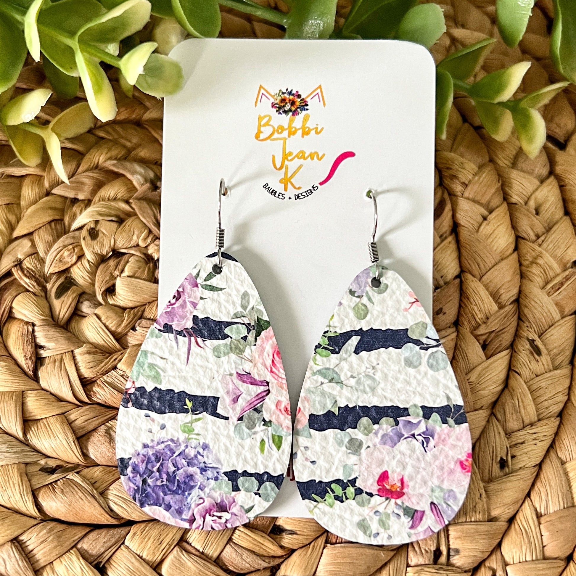 Navy Striped Floral Leather Earrings: Choose From 2 Styles - LAST CHANCE