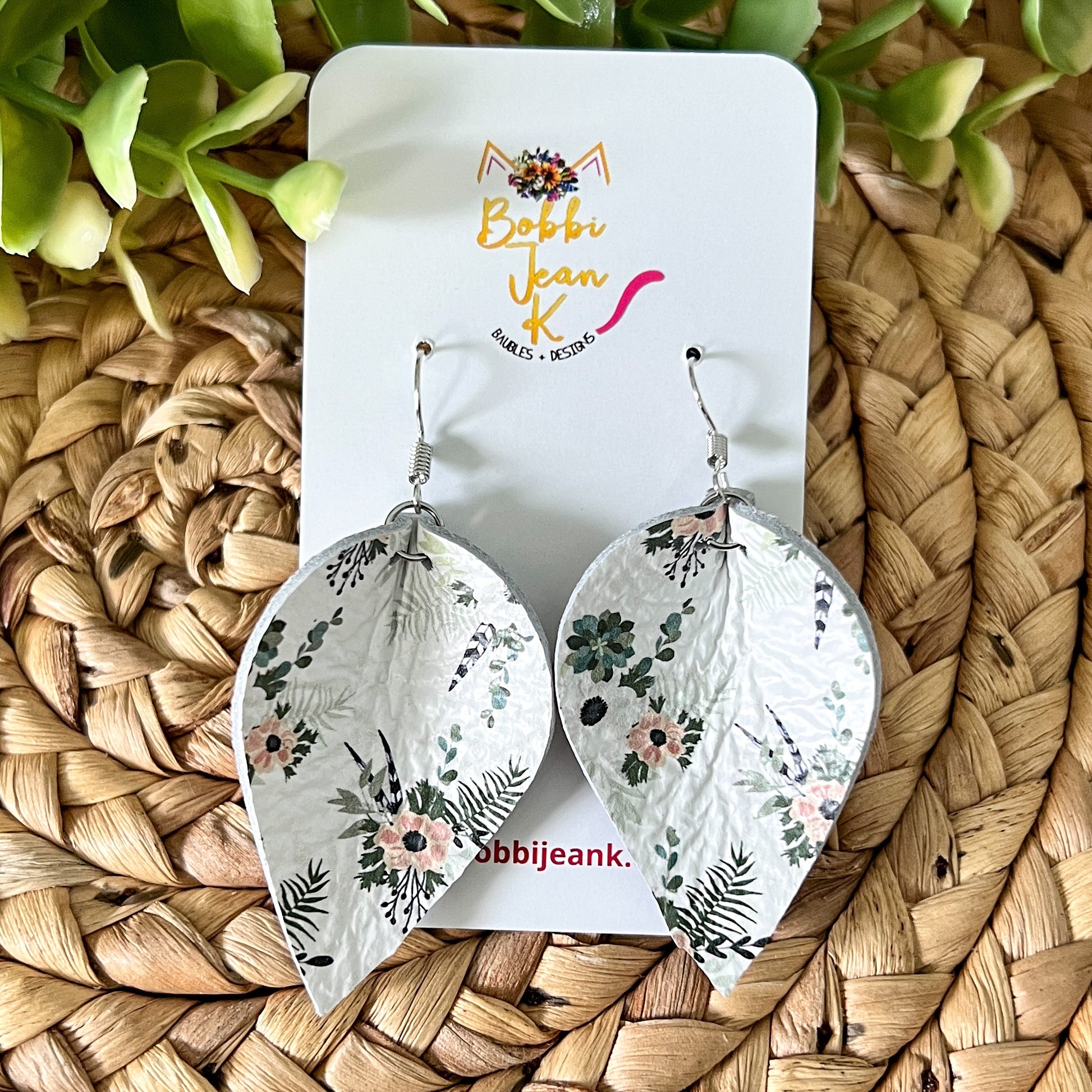 Neutral Floral Pinched Teardrop Leather Earrings: Choose From 2 Sizes