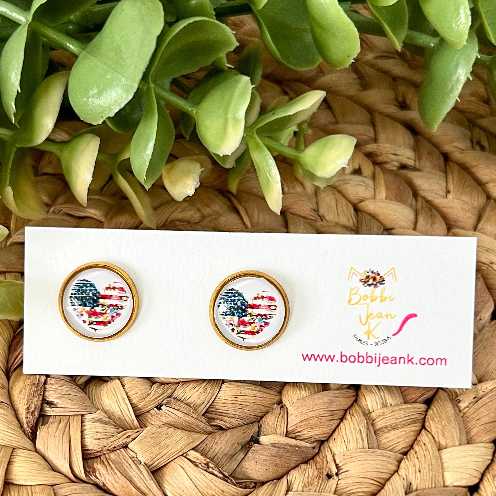 SALE: Patriotic Floral Heart Glass Studs 12mm: Choose Silver or Gold Settings - LAST CHANCE