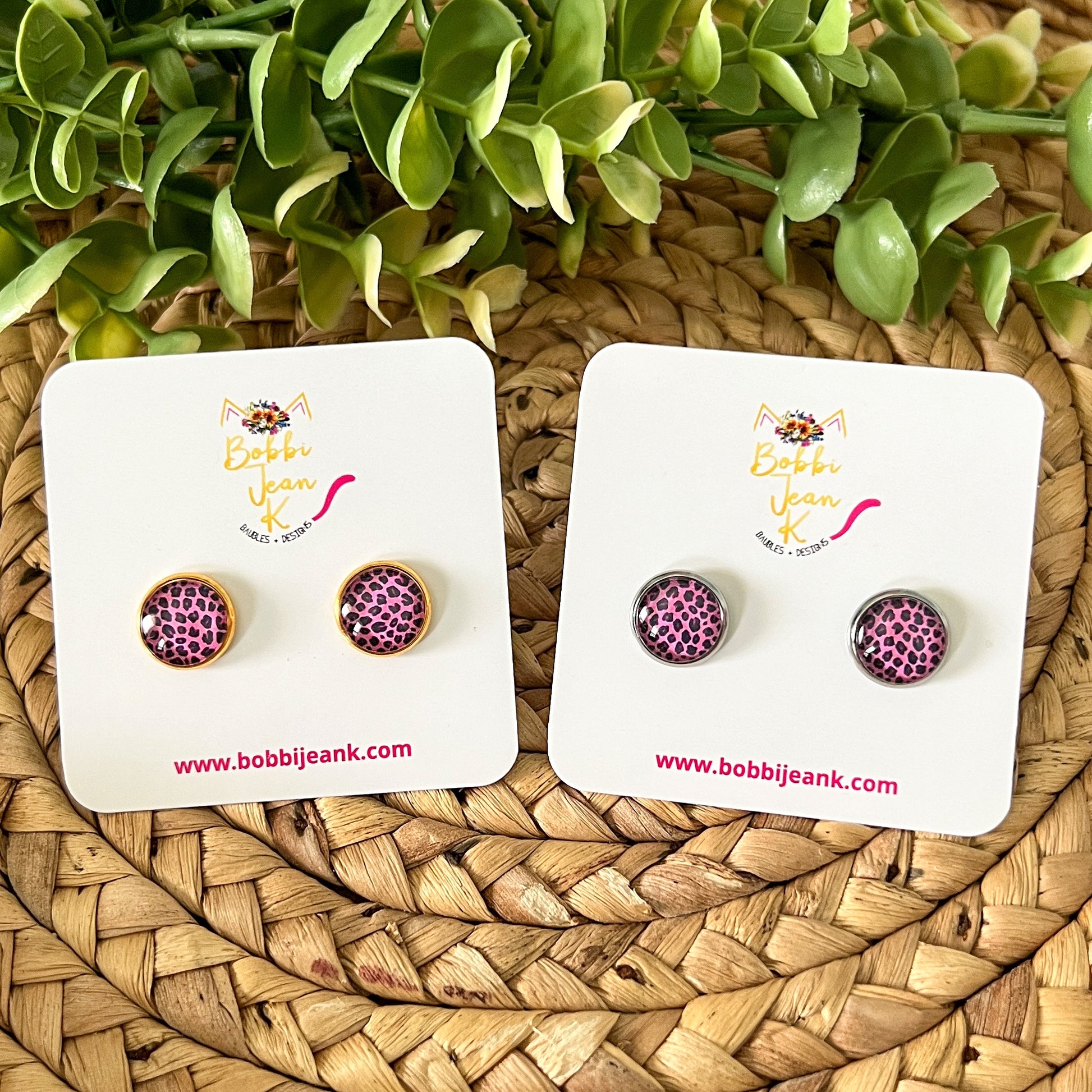 SALE: Pink & Black Leopard Animal Print Glass Studs 12mm: Choose Silver or Gold Settings - LAST CHANCE