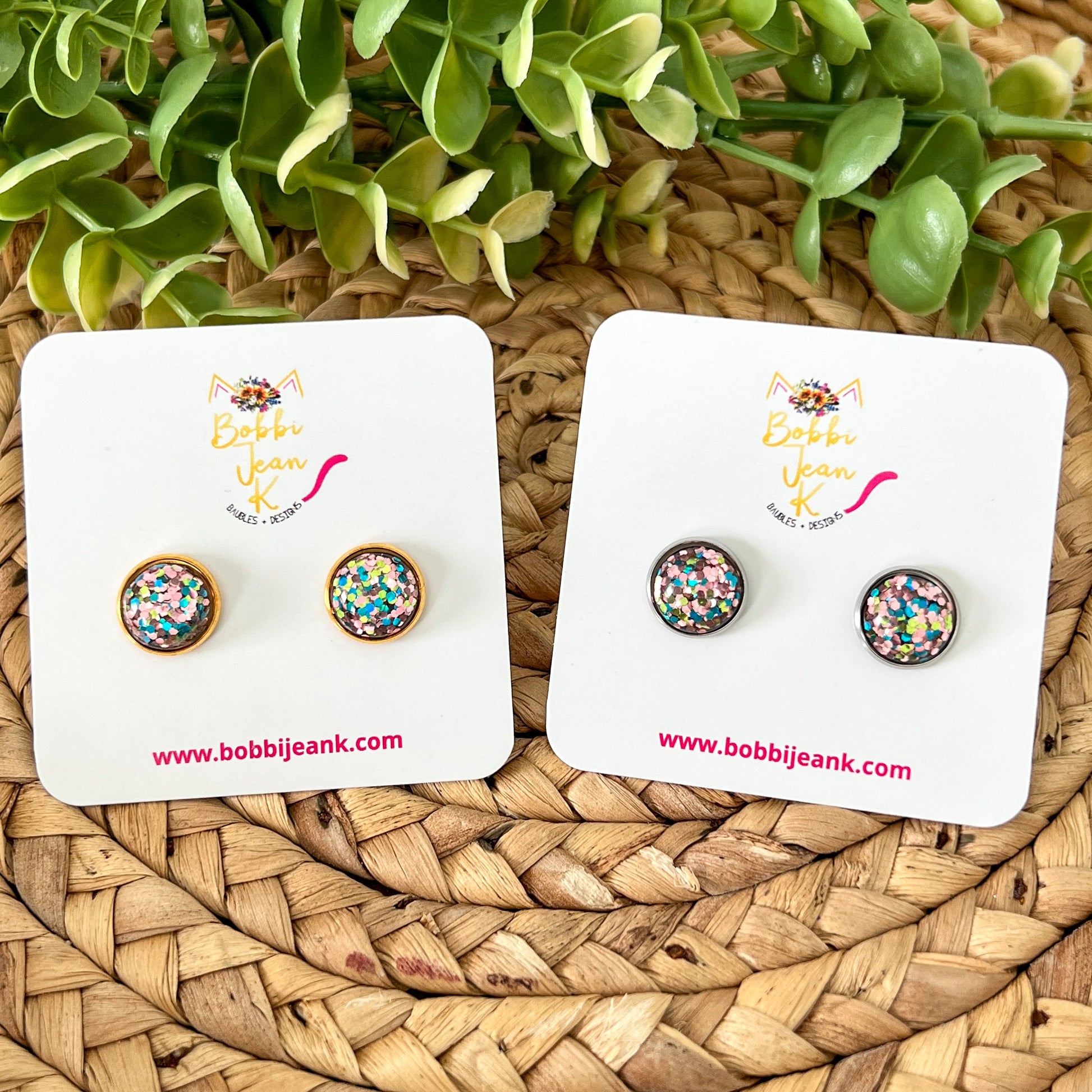 Design: Pink/Blue/Yellow Gold Glitter Studs (glitter DOES NOT flake off)