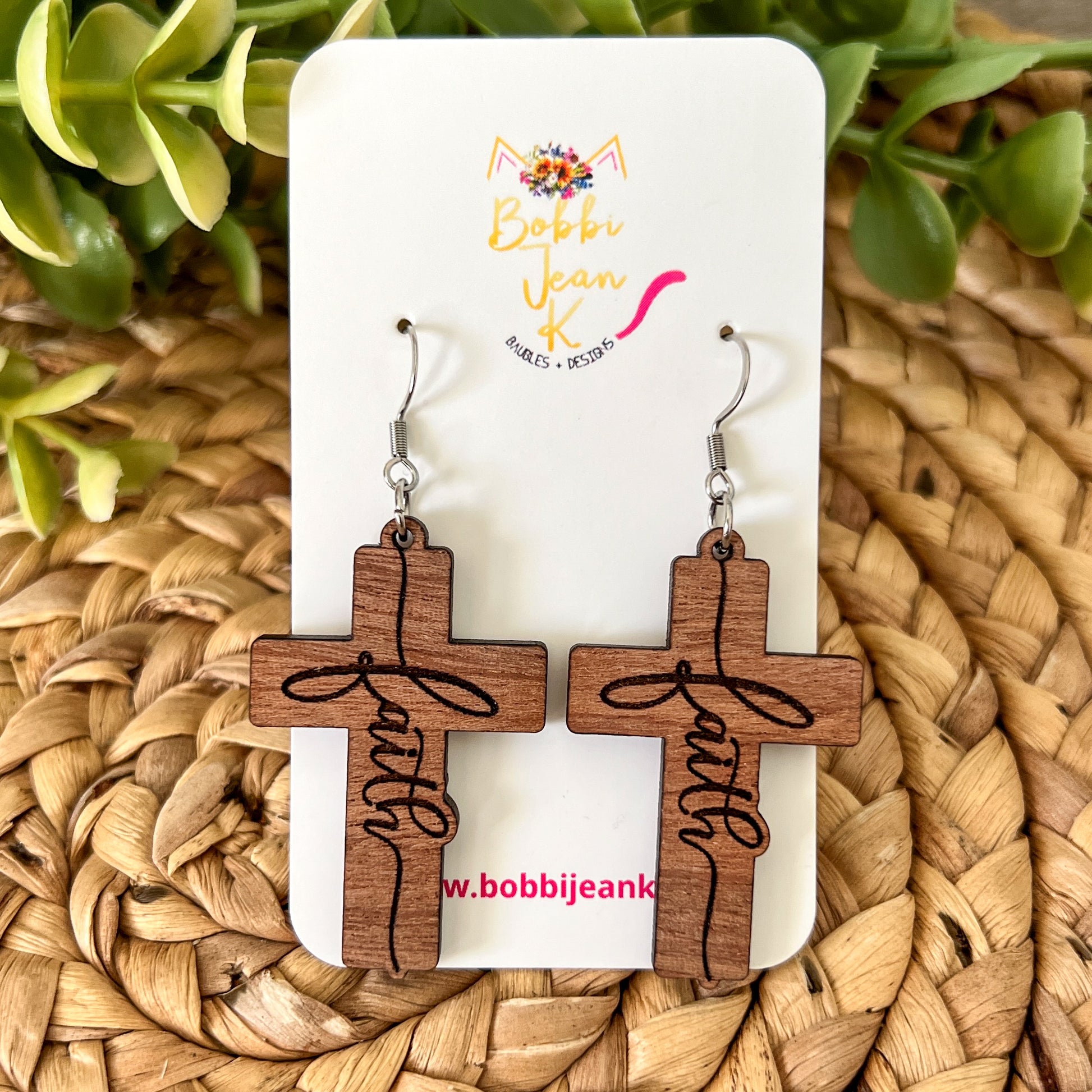 Sapele Wood Cross Earrings: Choose From Jesus, Faith, Hope, or Love