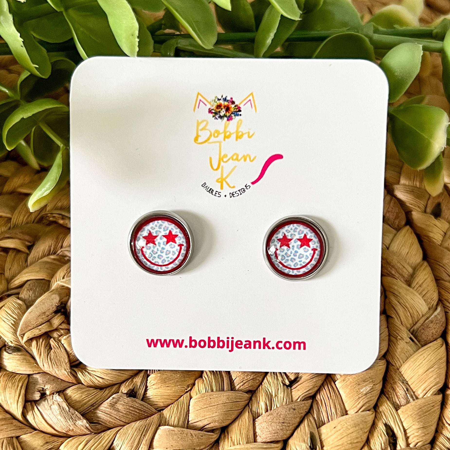 SALE: Star Smile Face Glass Studs 12mm: Choose Silver or Gold Settings - LAST CHANCE